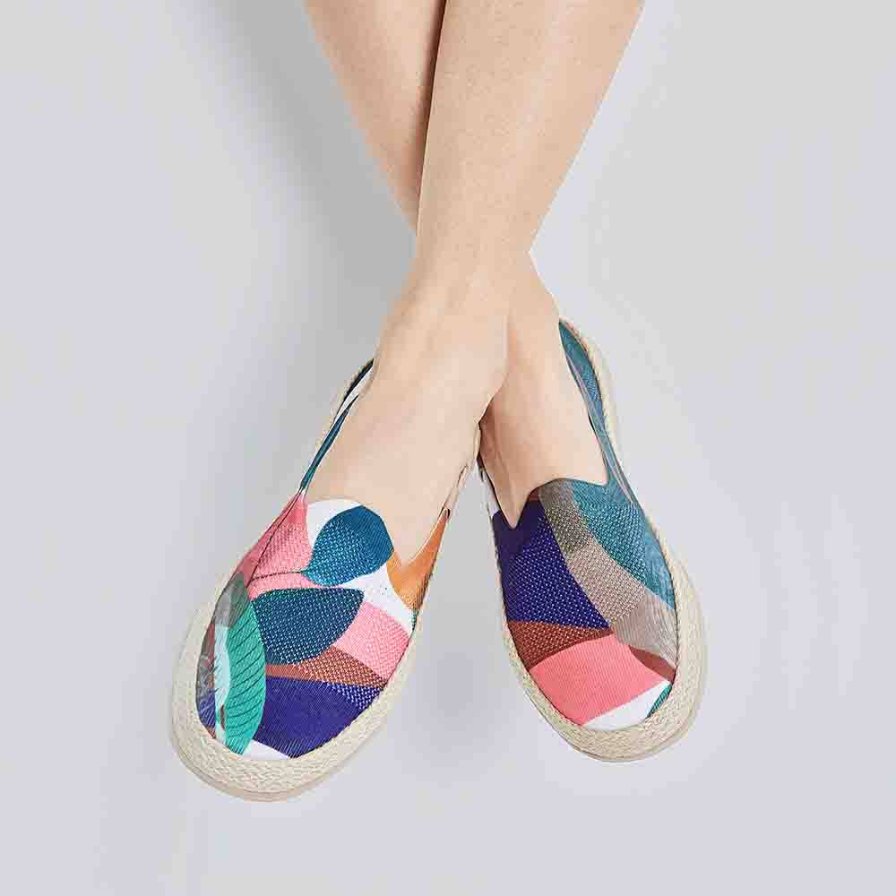 Broad Leaf was created as the concept of abstract geometrical elements inspired by the aesthetic tendency of magic realism. The complexity of colorful geometrical figures and tropical leaves presented on the canvas shoes underlines the simplicity and freshness of the summer.